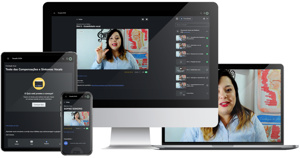 E para as 100 primeiras que entrarem no Desafio DOM, caso você execute os 7 dias de exercícios, mas não sinta diferença na sua voz, te daremos ainda uma análise vocal individual e ao vivo com um de nossos especialistas para garantir seu resultado.